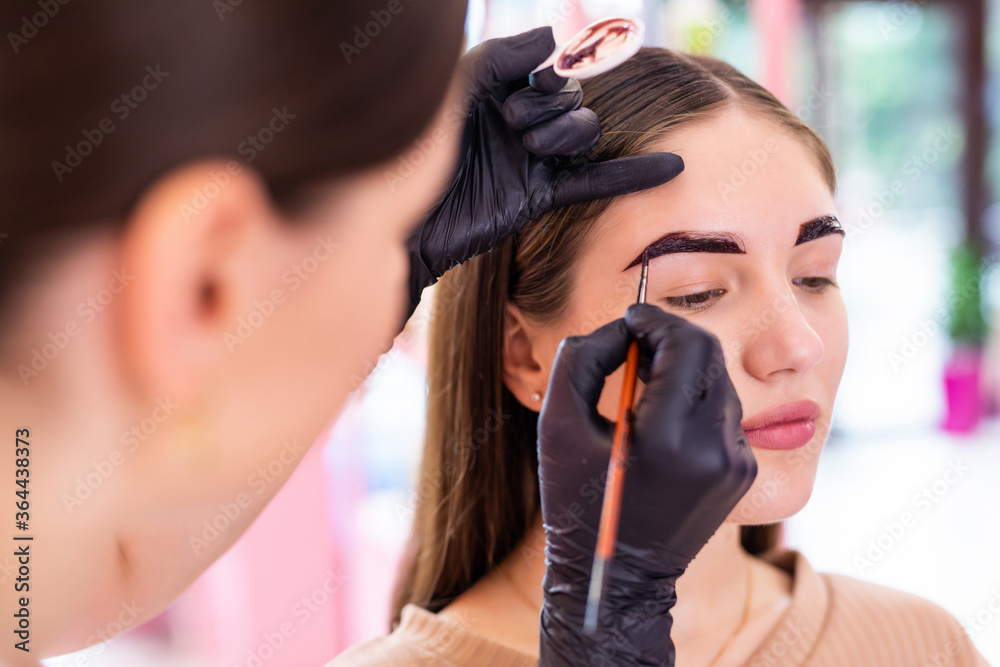 makeup artist applies paint henna on eyebrows in a beauty salon. Professional care for face.
