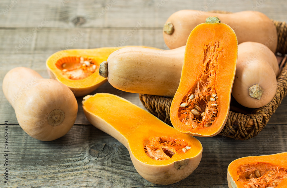 Fresh butternut squash on the wooden table