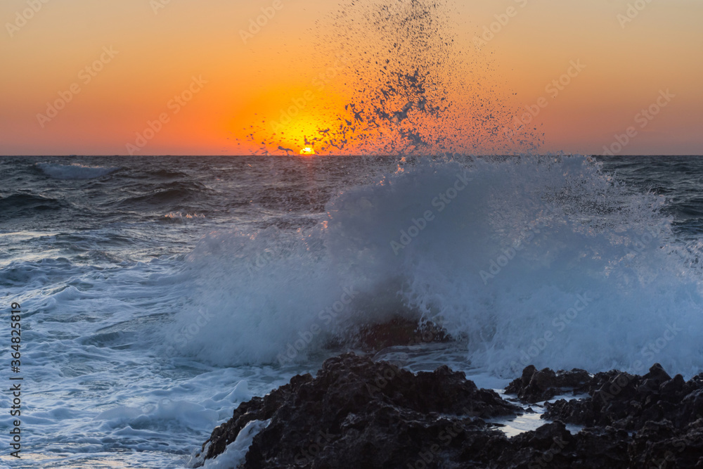 Sunset and storm at sea. Large waves against the background of the setting sun. Summer storm on the Black sea. Beautiful sea spray on the rocks.