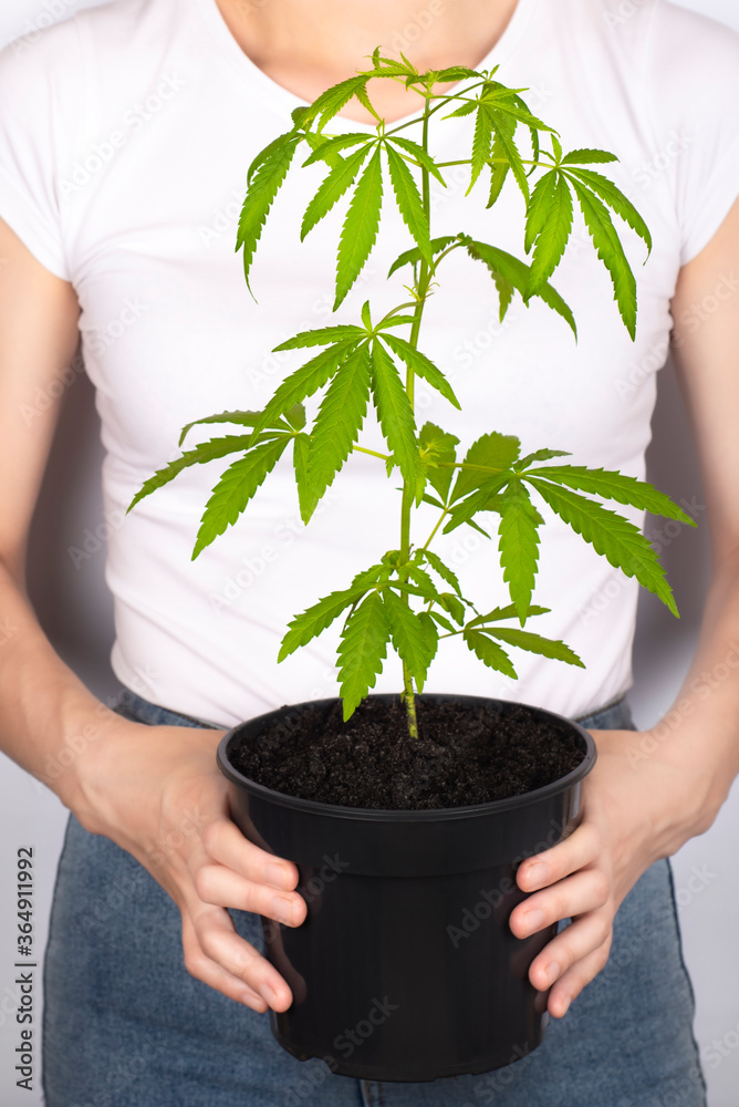 Young woman holding flower pot with cannabis or hemp plant.