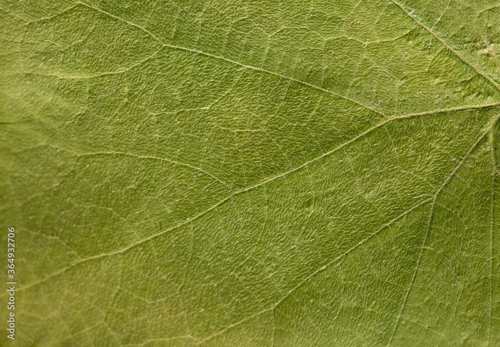 Green leaf with veins closeup. Macro herbarium, cucumber leaf.