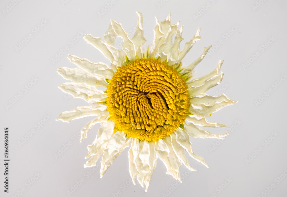Herbarium, closeup daisy flower, white petals, yellow center of the flower. Yellow stamens.