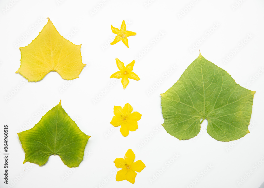 Herbarium from the plant. Cucumber. Bright yellow flowers, large green and yellow leaves.