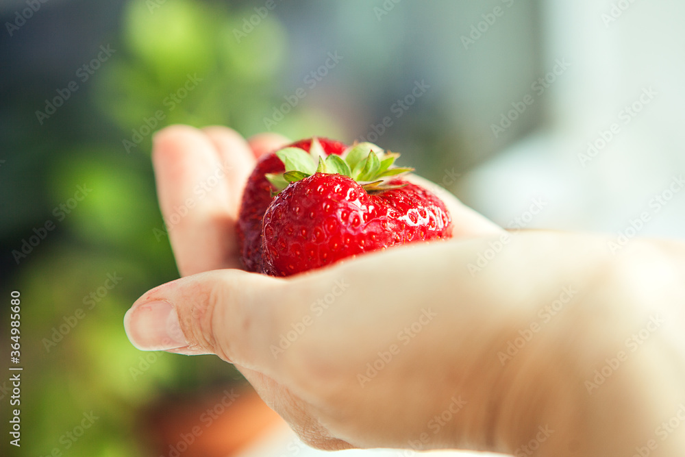 One red big strawberry in somebody's hand
