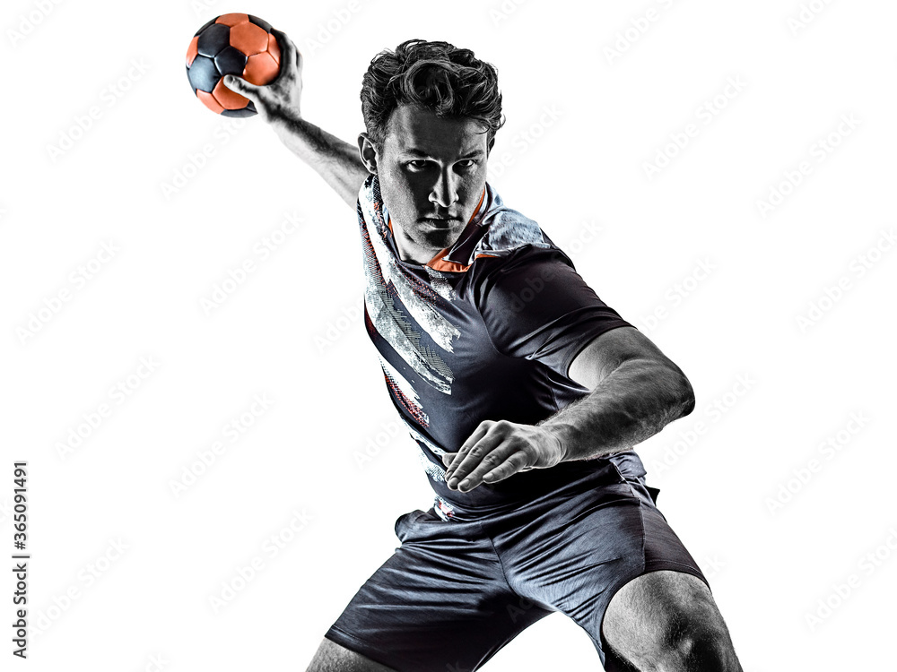 one young caucasian court handball player man in studio silhouette shadow isolated on white background