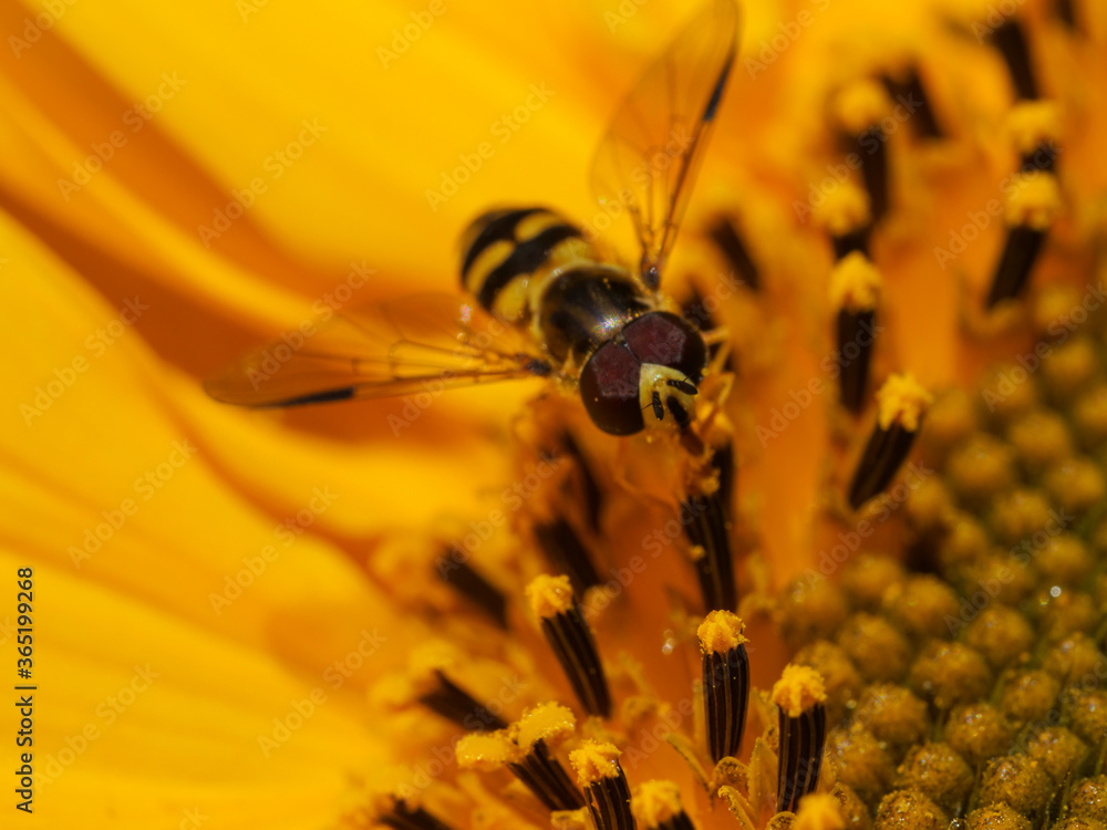 Macro photo of Hoverflies pollinating on the sunflower.Hoverflies, also called flower flies or syrphid flies, make up the insect family Syrphidae.