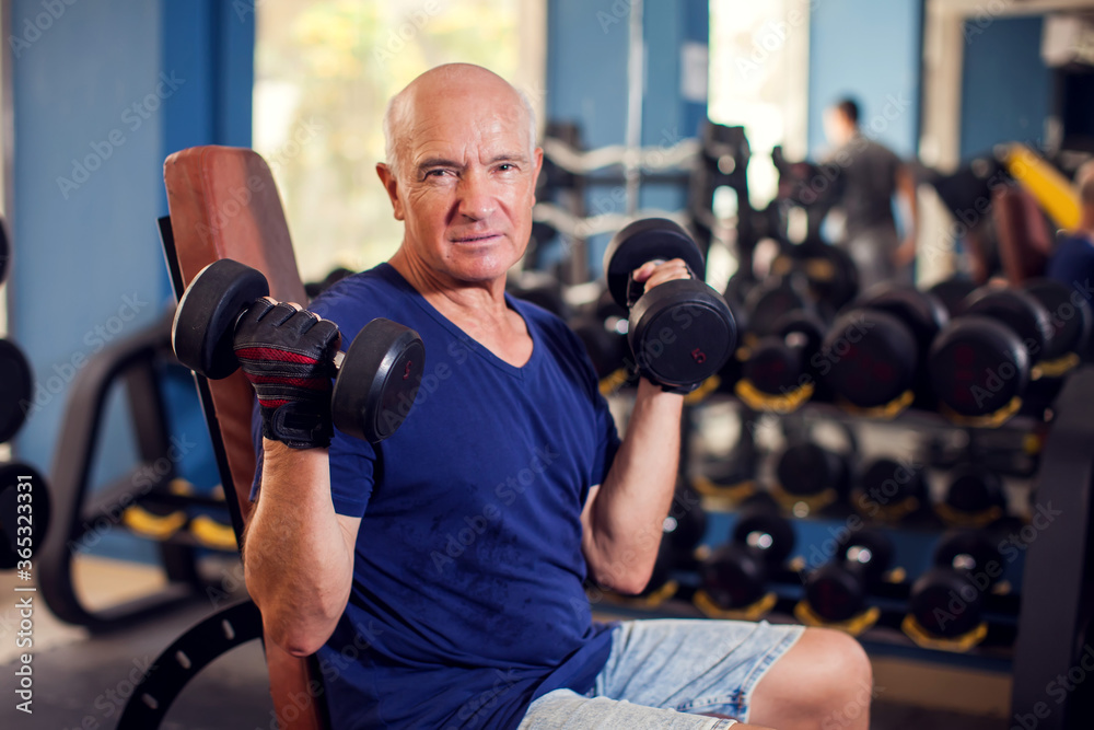 A portrait of senior man in the gym training with dumbbells. People, health and lifestyle concept