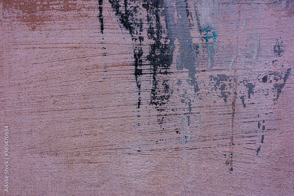 Colored cement plaster with traces of sanding and scratches, spilled with paint on the wall.