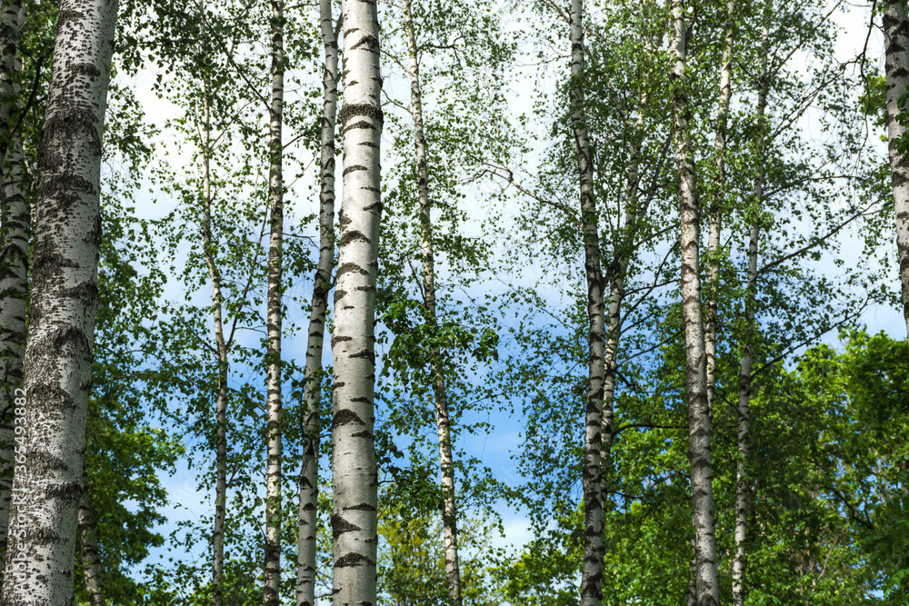 The white trunks of birches. Birch grove. Beautiful summer natural background. A real Russian landscape. Bottom view of foliage and clouds.