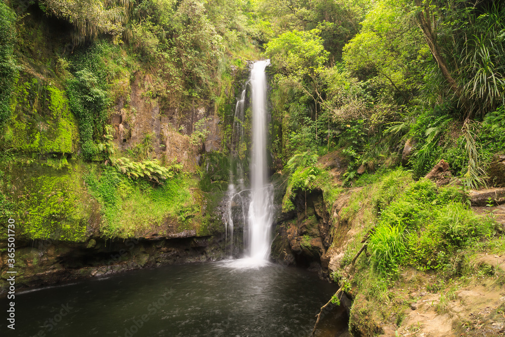 Kaiate Falls ("Te Rerekawau") in the Bay of Plenty, New Zealand, a classic "horsetail" waterfall that cascades into a deep pool