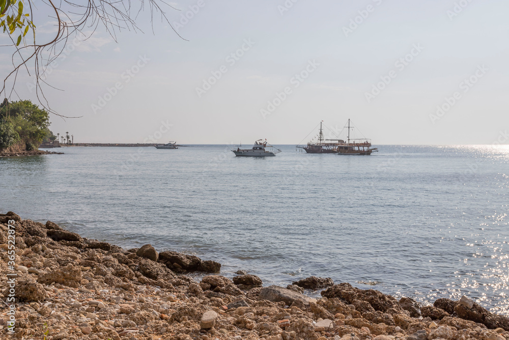 Side, Turkey 2020: boat, ship with tourists at sea