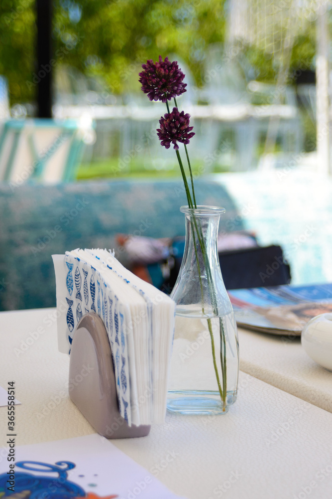 Transparent plastic chairs and a table on a background of blue sea. Preparing for dinner in a restaurant by the sea.
