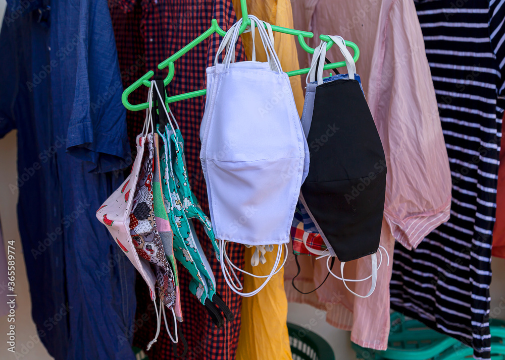 Cotton cloth mask hanging outdoor after the used and washing. fabric cotton face mask bring to dry with the sunlight. Protection against pollution, virus, flu and coronavirus. Healthcare and medical.