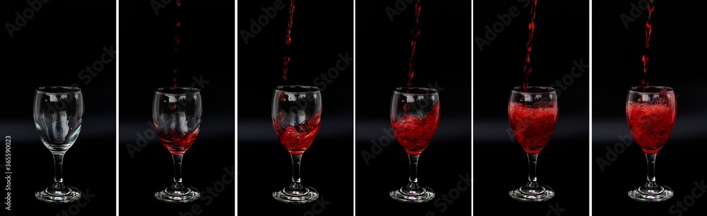Beautiful wine glass There is a process of pouring red wine into the glass on a black background with the copying area.