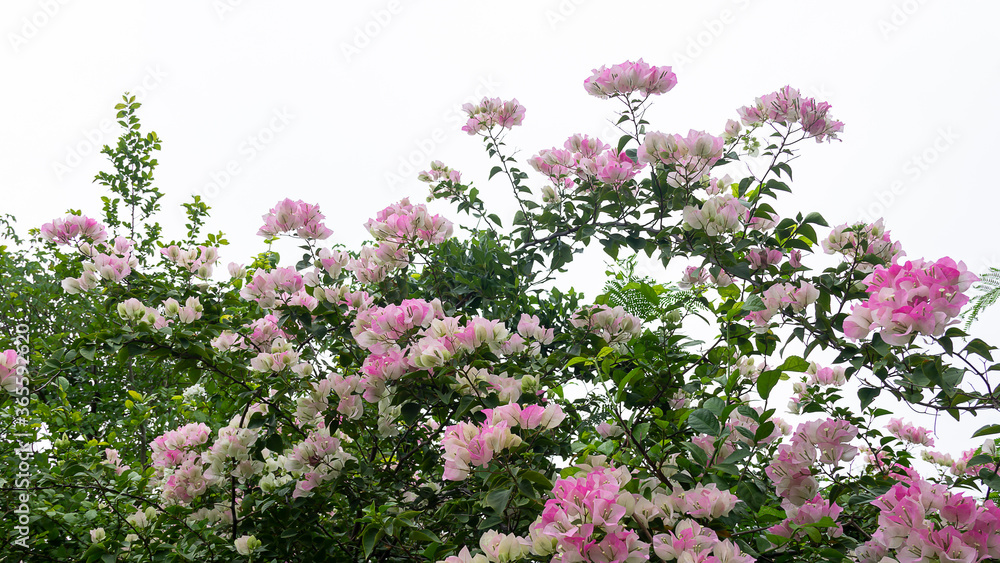 Bougainvillea flowers and bougainvillea plant tree in summer season. This Bougainvillea flowers are pink and purple. Magenta bougainvillea flowers. Postcard or wallpaper texture pattern background.