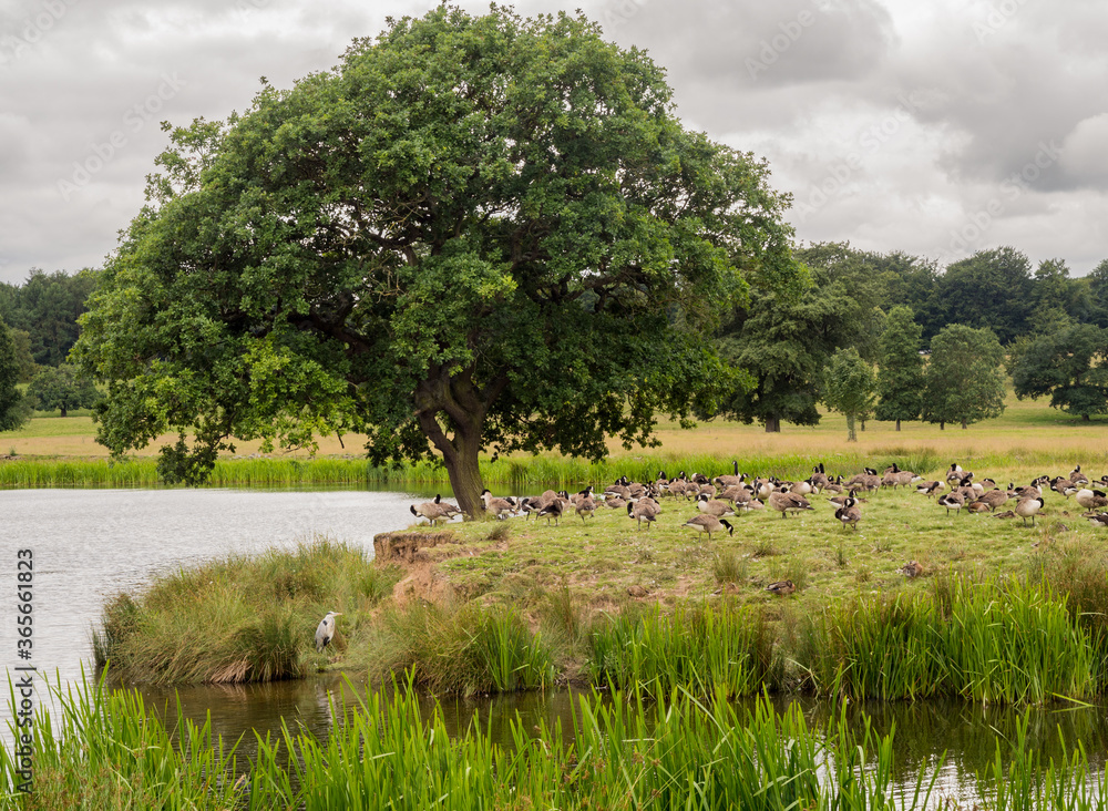 Canada geese resting together by the waters edge at Tatton Park, Knutsford, Cheshire, UK