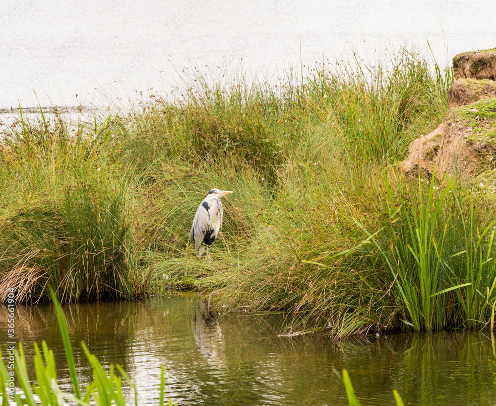 Grey heron taking a rest on edge of lake at Tatton Park, Knutsford, Cheshire, UK
