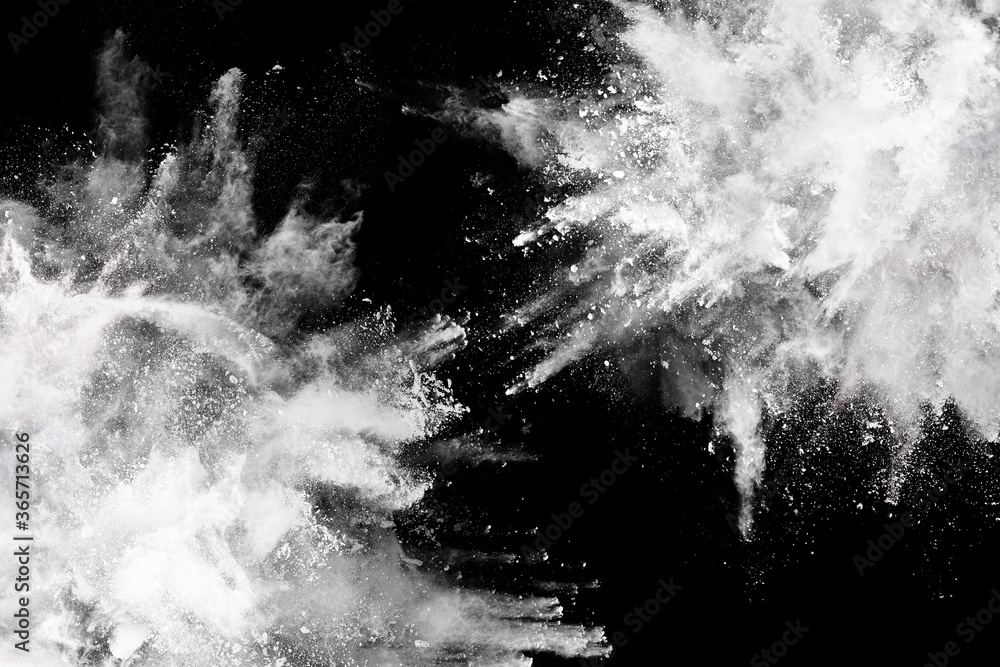 White powder explosion on black background. Colored cloud. Colorful dust explode. Paint Holi.
