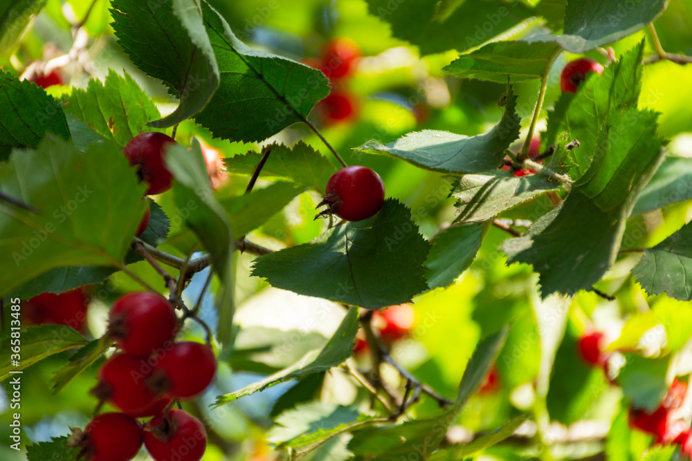 Hawthorn on a Bush close-up. Ripe hawthorn berries. Useful and medicinal berries. Harvest. Red berries in beautiful sunlight in the garden.