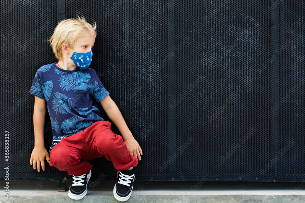 Portrait of child in funny protective mask. New rules to keep social distancing, wear face covering at public places. Cancelled cruise, tour due coronavirus COVID 19. Family lifestyle at summer 2020.
