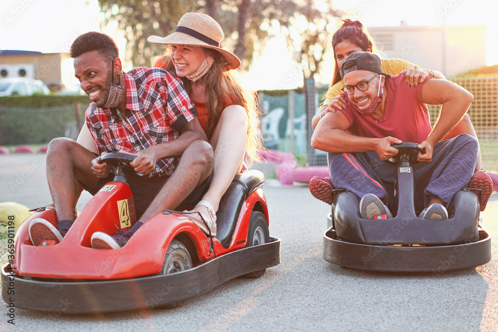 Group of multietnic friends having fun with go kart - Young people with face mask on smiling and cheerful at mini car racing - Couples outside in double date - New lifestyle