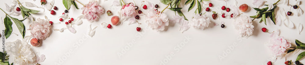 Summer fruit and flowers layout. Flat-lay of white and pink peony flowers, cherries, strawberries and peaches over plain white background, top view, copy space