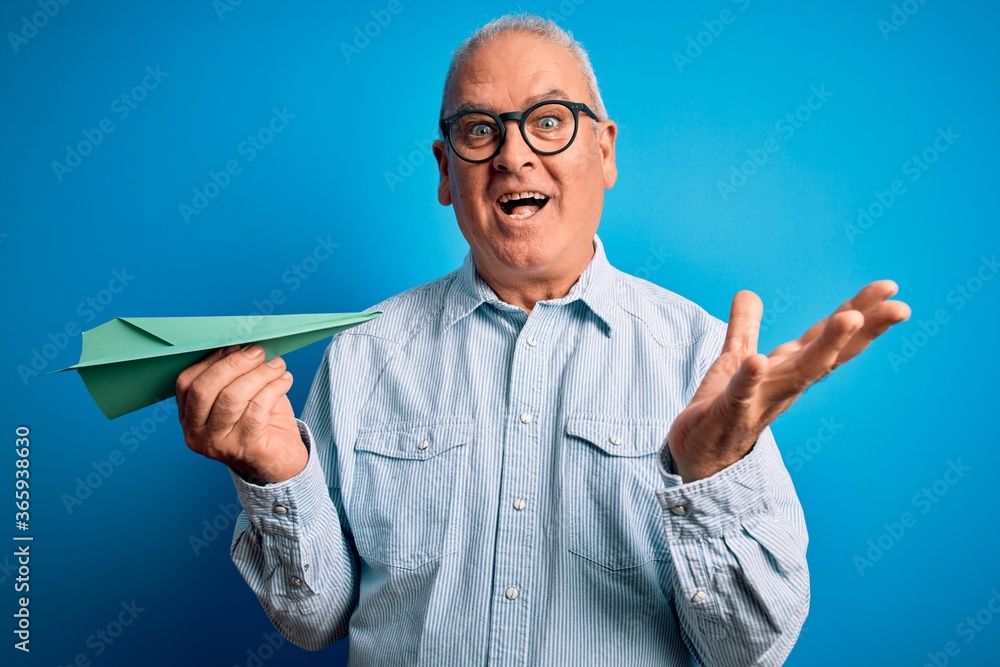 Middle age handsome hoary man holding paper airplane over isolated blue background very happy and excited, winner expression celebrating victory screaming with big smile and raised hands