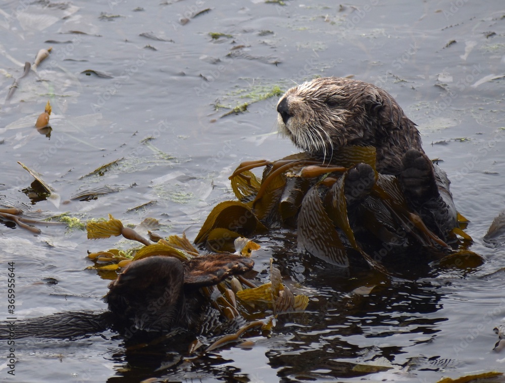 A sea otter (Enhydra lutris) wraps itself in kelp to keep it in place, near the mouth of Elkhorn Slough in California.