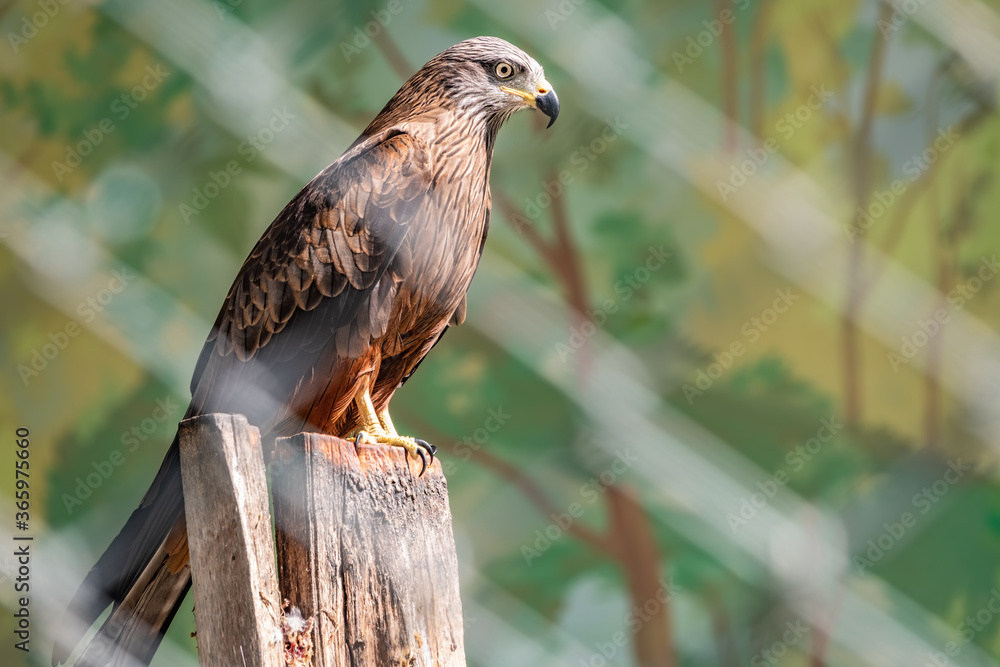 The common buzzard Buteo buteo bird of prey sits on branch in the aviary