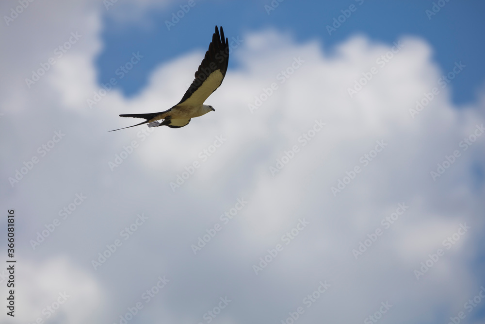 Elegant Swallow-tailed kite forages for large insects flying over a melon field outside the Lower Suwannee National Wildlife Refuge, Cedar Key, Florida, which is the key habitat for this bird.