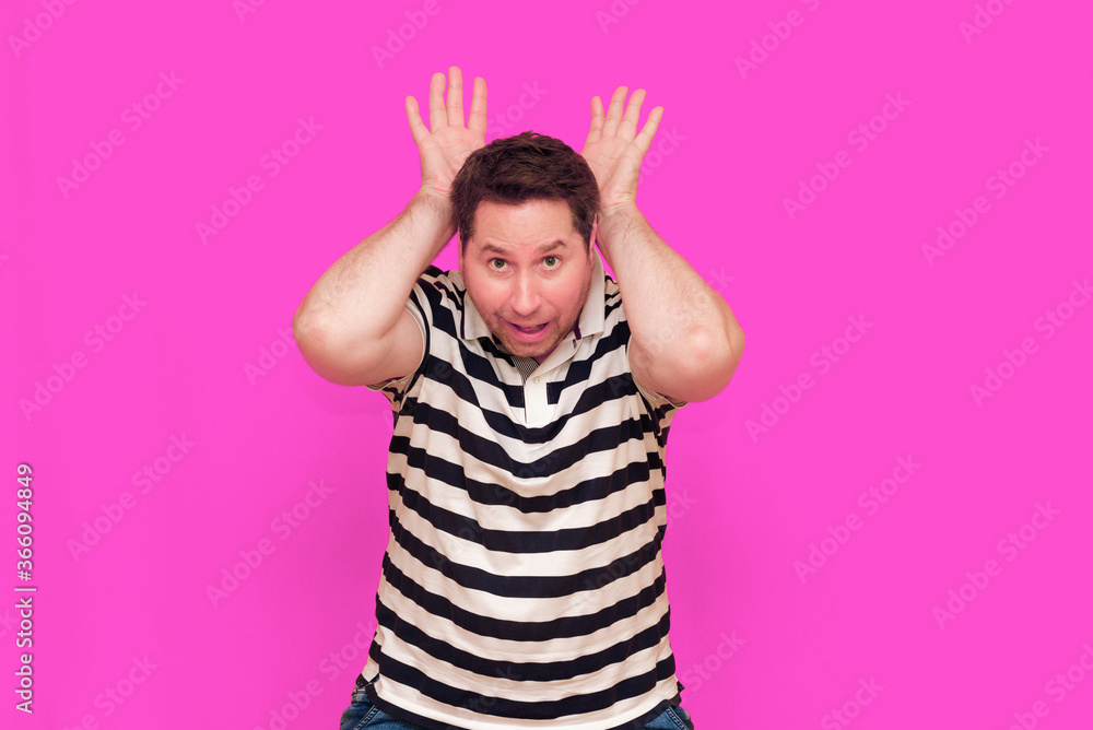 Caucasian man wearing casual striped t-shirt standing over isolated hot pink background shows various gestures.