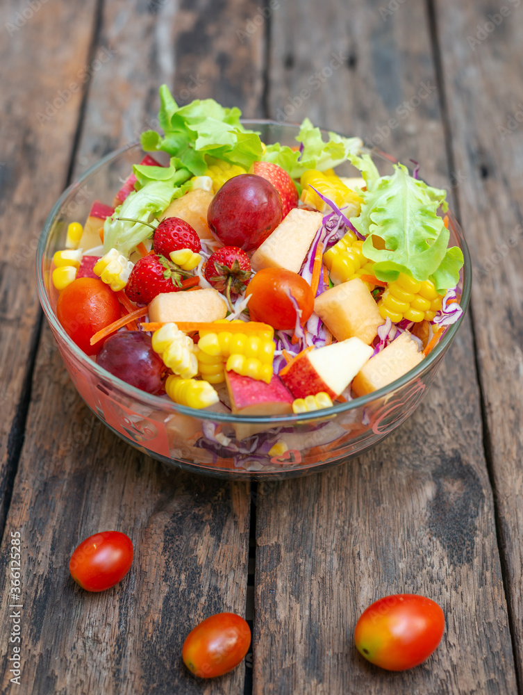 Fruits salad and vegetable in bowl on wooden table