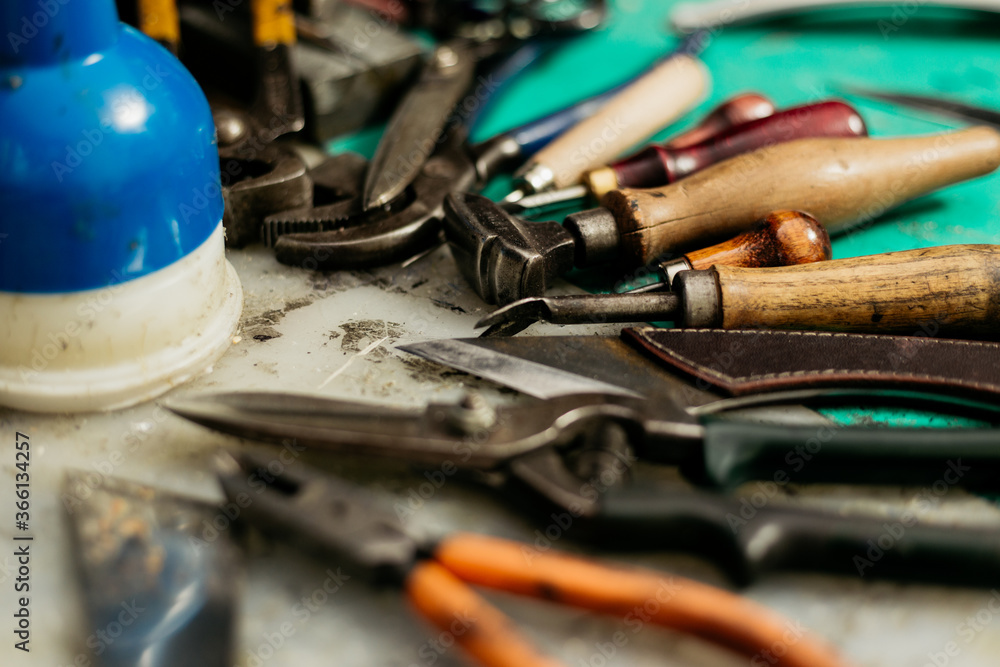 Low angle-side view on old-fashioned shoemaker's tool on dirty desk.