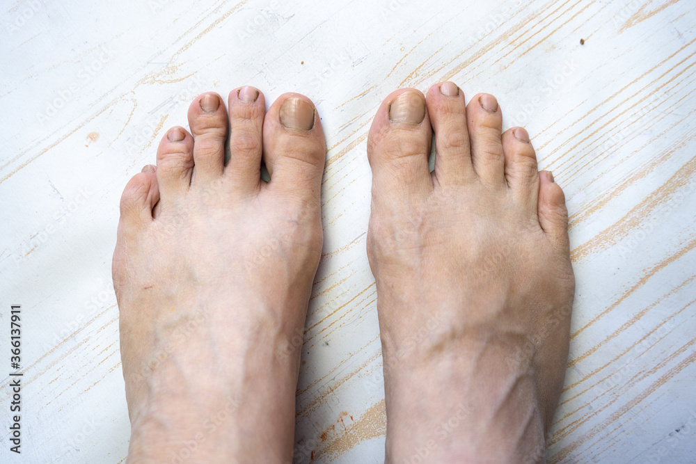 bare feet of caucasian female in bad condition, dry unhealthy toes with dirty damaged nails