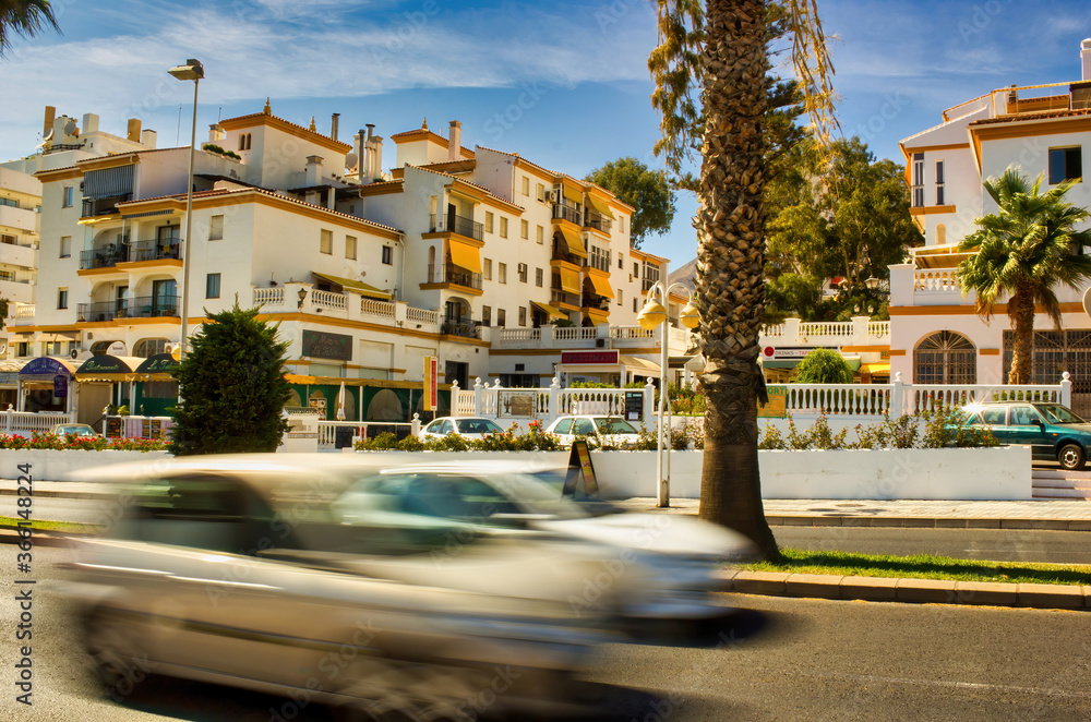 Malaga, Spain - September 01, 2015: Motion blurred traffic in the busy city on a sunny summer time located in Costa del Sol Occidental is a comarca in Andalusia, southern Spain