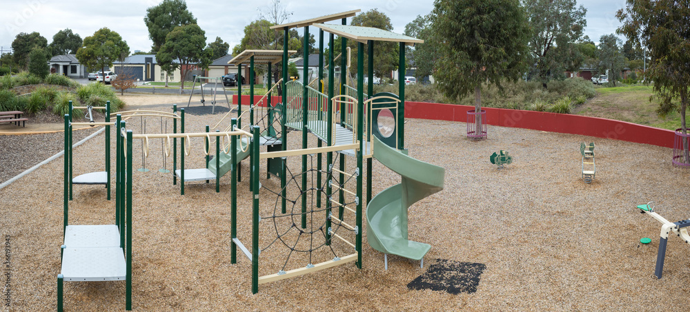 Perspective/panoramic view of a public outdoor children's playground with wood chips on ground in a suburban neighbourhood with some Australian modern homes in the distance. Melbourne, Australia.