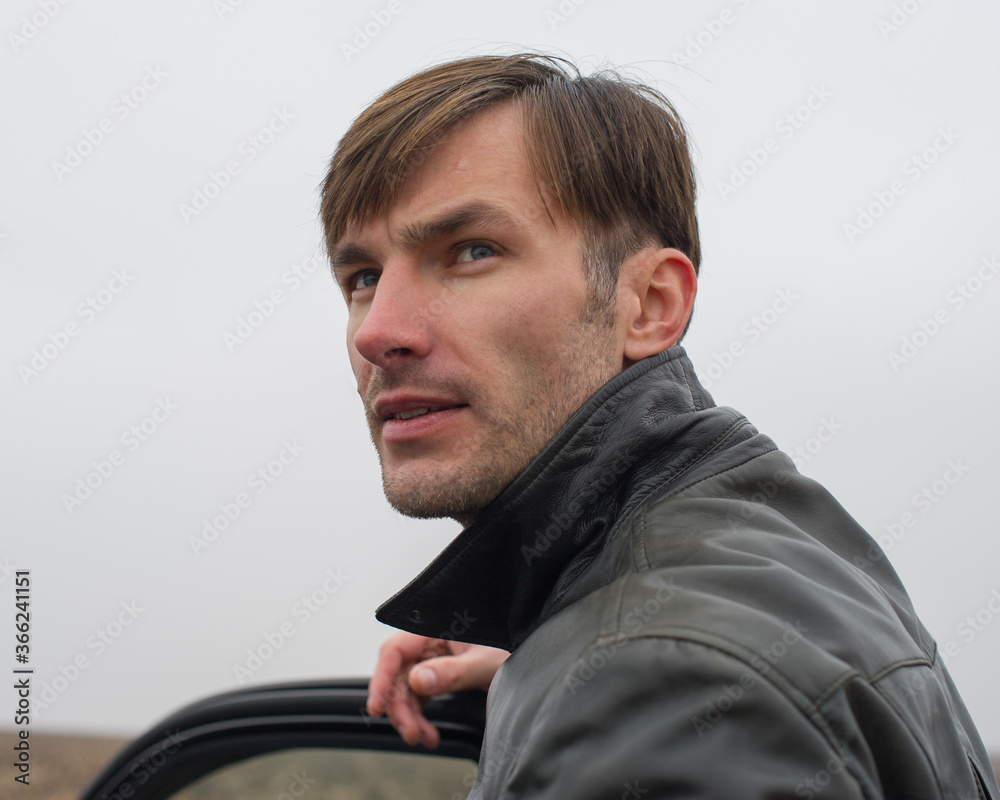 man looks into the distance with his head turned to the side against the background of a light sky.
