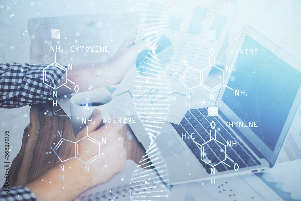 DNA hologram with businessman working on computer on background. Concept of bioengineering. Double exposure.