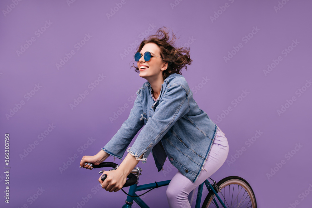 Dark-haired joyful lady chilling during photoshoot on bike. Winsome caucasian girl with wavy hair sitting on bicycle.