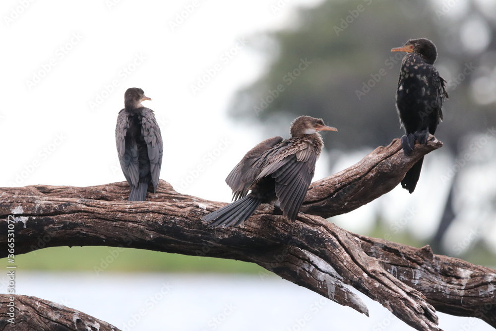 African Cormorants and Darter birds by the Chobe River in Botswana