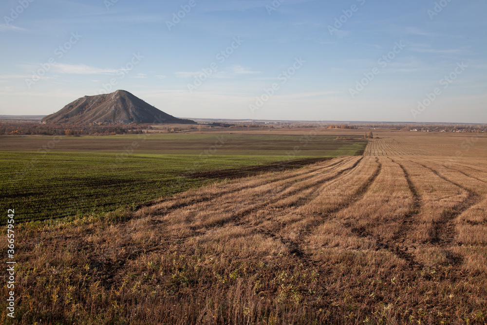 Autumn field sown before winter. Green shoots form a striped pattern against the backdrop of a solitary mountain and trees with yellow foliage.