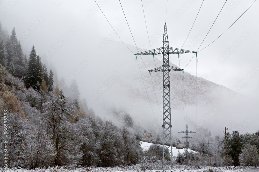 Power lines on a foggy and snowy day, Georgia, Caucasus Mountains