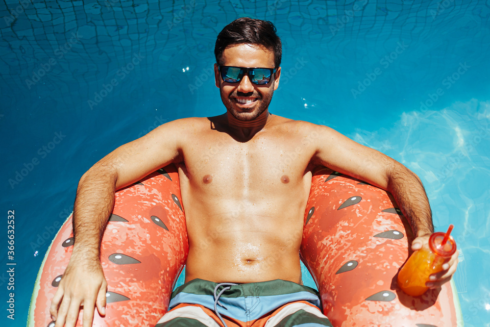 Handsome man relaxing alone on a float in the pool on a hot summer day