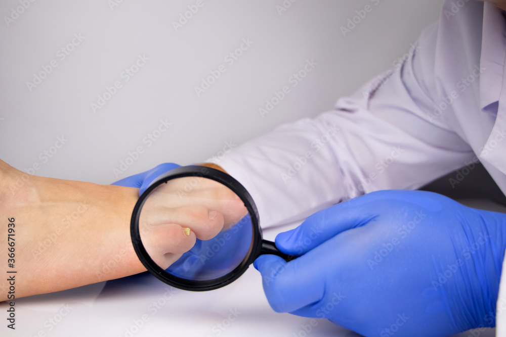 A trichologist examines a toenail with a magnifying glass, which is affected by the fungus. Treatment of mycosis and assistance to patients with fungal diseases.