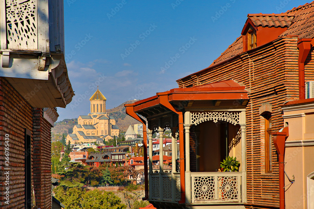 View over the Sameba Cathedral through historical houses in Tbilisi, capital of Georgia