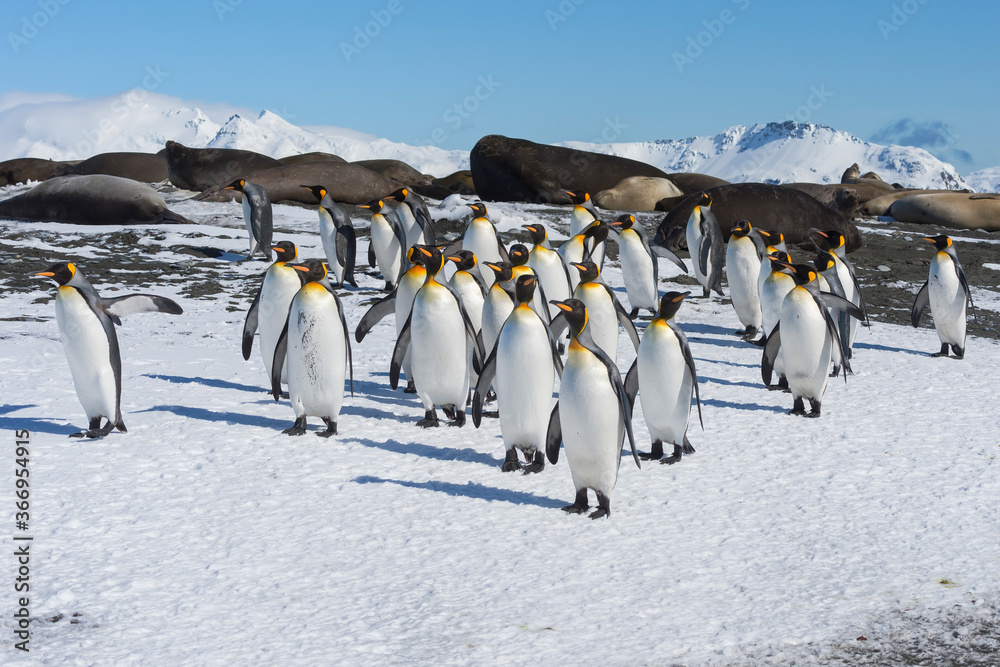 King Penguins (Aptenodytes patagonicus) walking on snow covered Salisbury Plain, South Georgia Island, Antarctic
