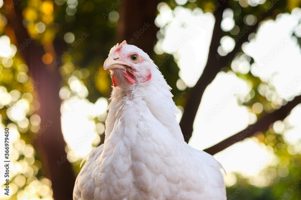 Broiler chickens at sunset. Domestic chicken photo portrait in the setting sun.