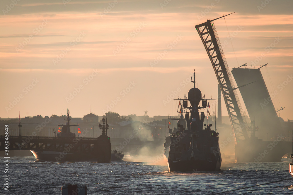 View of Russian Navy, modern russian military naval battleships warships in the row, northern fleet and baltic sea fleet, summer sunny day during the military exercise