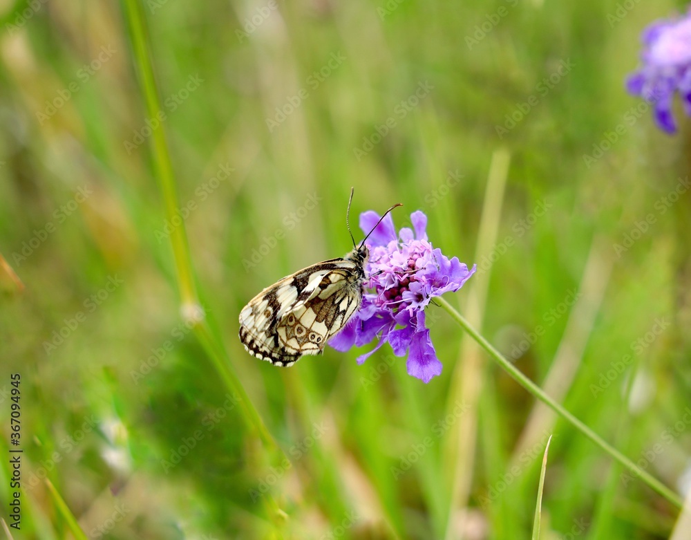 Marbled white pollinating on the flower of caucasian pincushion. The marbled white, is a butterfly in the family Nymphalidae.