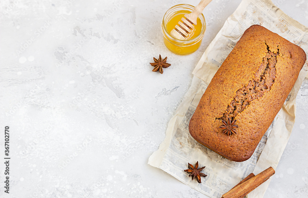 Spicy honey cake with cinnamon and anise star on light grey concrete background. Honey cake for Rosh Hashanah.